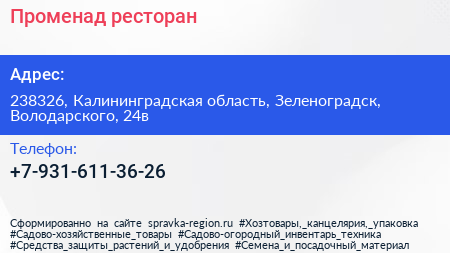 Променад, ресторан по адресу 238326, Калининградская область, Зеленоградск, Володарского, 24в в дальнейшем Организация, размещена в следующих категориях: