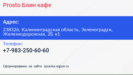 Prosto Блин, кафе по адресу 238326, Калининградская область, Зеленоградск, Железнодорожная, 2Б к1 в дальнейшем Организация, размещена в следующих категориях: