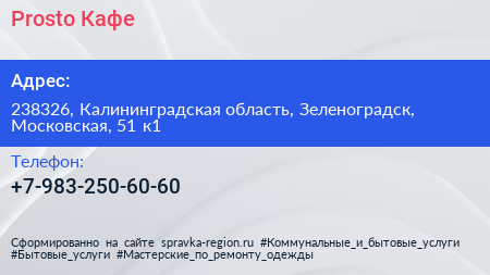Prosto Кафе по адресу 238326, Калининградская область, Зеленоградск, Московская, 51 к1 в дальнейшем Организация, размещена в следующих категориях:
