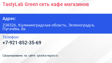 TastyLab Green, сеть кафе-магазинов по адресу 238326, Калининградская область, Зеленоградск, Пугачёва, 8а в дальнейшем Организация, размещена в следующих категориях: