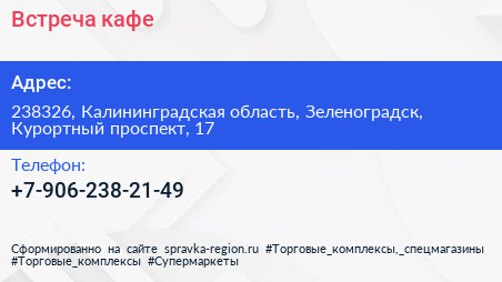 Встреча, кафе по адресу 238326, Калининградская область, Зеленоградск, Курортный проспект, 17 в дальнейшем Организация, размещена в следующих категориях: