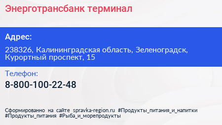 Энерготрансбанк, терминал по адресу 238326, Калининградская область, Зеленоградск, Курортный проспект, 15 в дальнейшем Организация, размещена в следующих категориях: