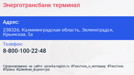Энерготрансбанк, терминал по адресу 238326, Калининградская область, Зеленоградск, Крымская, 5а в дальнейшем Организация, размещена в следующих категориях: