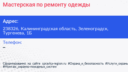 Мастерская по ремонту одежды по адресу 238326, Калининградская область, Зеленоградск, Тургенева, 1Б в дальнейшем Организация, размещена в следующих категориях: