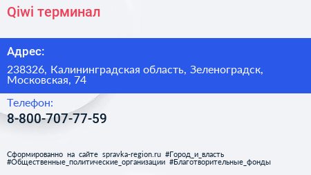 Qiwi, терминал по адресу 238326, Калининградская область, Зеленоградск, Московская, 74 в дальнейшем Организация, размещена в следующих категориях: