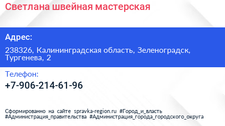 Светлана, швейная мастерская по адресу 238326, Калининградская область, Зеленоградск, Тургенева, 2 в дальнейшем Организация, размещена в следующих категориях: