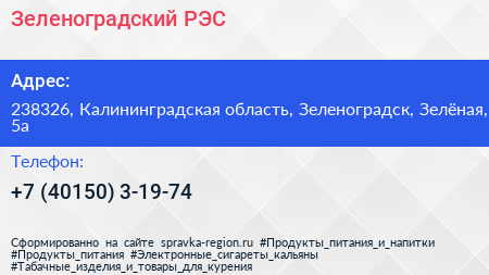 Зеленоградский РЭС по адресу 238326, Калининградская область, Зеленоградск, Зелёная, 5а в дальнейшем Организация, размещена в следующих категориях: