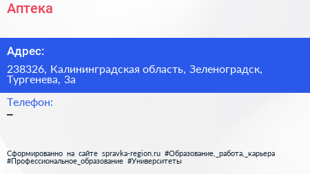 Аптека по адресу 238326, Калининградская область, Зеленоградск, Тургенева, 3а в дальнейшем Организация, размещена в следующих категориях: