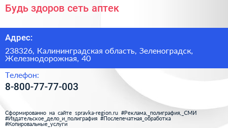 Будь здоров, сеть аптек по адресу 238326, Калининградская область, Зеленоградск, Железнодорожная, 40 в дальнейшем Организация, размещена в следующих категориях: