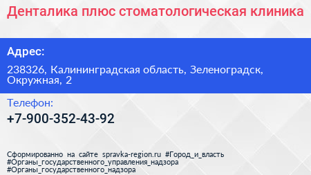 Денталика плюс, стоматологическая клиника по адресу 238326, Калининградская область, Зеленоградск, Окружная, 2 в дальнейшем Организация, размещена в следующих категориях: