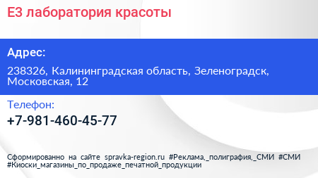 Е3, лаборатория красоты по адресу 238326, Калининградская область, Зеленоградск, Московская, 12 в дальнейшем Организация, размещена в следующих категориях:
