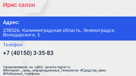 Ирис, салон по адресу 238326, Калининградская область, Зеленоградск, Володарского, 1 в дальнейшем Организация, размещена в следующих категориях: