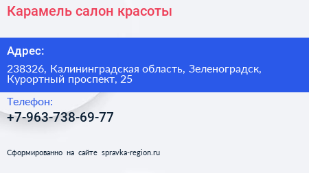 Карамель, салон красоты по адресу 238326, Калининградская область, Зеленоградск, Курортный проспект, 25 в дальнейшем Организация, размещена в следующих категориях: