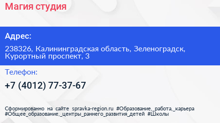 Магия, студия по адресу 238326, Калининградская область, Зеленоградск, Курортный проспект, 3 в дальнейшем Организация, размещена в следующих категориях: