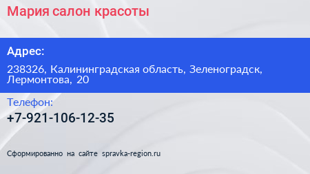 Мария, салон красоты по адресу 238326, Калининградская область, Зеленоградск, Лермонтова, 20 в дальнейшем Организация, размещена в следующих категориях: