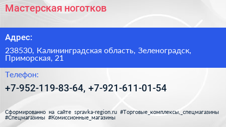 Мастерская ноготков по адресу 238530, Калининградская область, Зеленоградск, Приморская, 21 в дальнейшем Организация, размещена в следующих категориях: