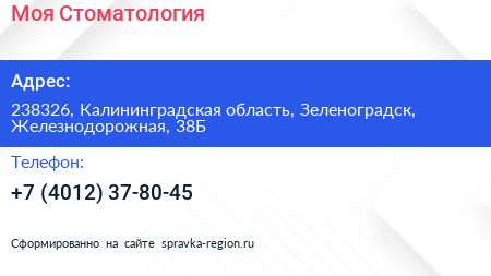 Моя Стоматология по адресу 238326, Калининградская область, Зеленоградск, Железнодорожная, 38Б в дальнейшем Организация, размещена в следующих категориях: