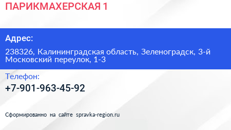 ПАРИКМАХЕРСКАЯ № 1 по адресу 238326, Калининградская область, Зеленоградск, 3-й Московский переулок, 1-3 в дальнейшем Организация, размещена в следующих категориях: