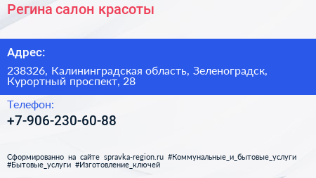 Регина, салон красоты по адресу 238326, Калининградская область, Зеленоградск, Курортный проспект, 28 в дальнейшем Организация, размещена в следующих категориях: