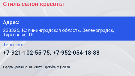 Стиль, салон красоты по адресу 238326, Калининградская область, Зеленоградск, Тургенева, 1Б в дальнейшем Организация, размещена в следующих категориях: