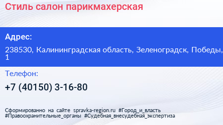 Стиль, салон-парикмахерская по адресу 238530, Калининградская область, Зеленоградск, Победы, 1 в дальнейшем Организация, размещена в следующих категориях: