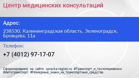 Центр медицинских консультаций по адресу 238530, Калининградская область, Зеленоградск, Бровцева, 11а в дальнейшем Организация, размещена в следующих категориях: