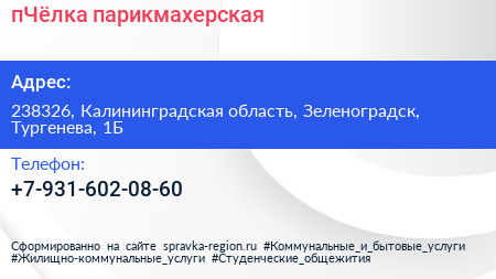 пЧёлка, парикмахерская по адресу 238326, Калининградская область, Зеленоградск, Тургенева, 1Б в дальнейшем Организация, размещена в следующих категориях: