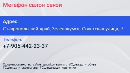Мегафон, салон связи по адресу Ставропольский край, Зеленокумск, Советская улица, 7 в дальнейшем Организация, размещена в следующих категориях: