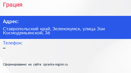 Грация по адресу Ставропольский край, Зеленокумск, улица Зои Космодемьянской, 36 в дальнейшем Организация, размещена в следующих категориях: