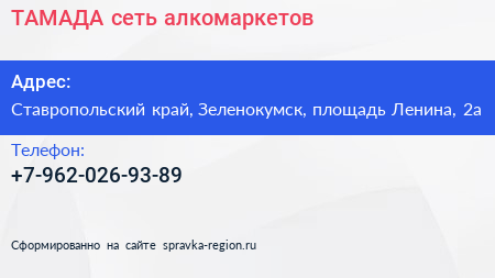 ТАМАДА, сеть алкомаркетов по адресу Ставропольский край, Зеленокумск, площадь Ленина, 2а в дальнейшем Организация, размещена в следующих категориях: