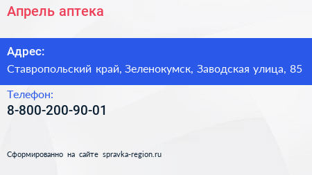 Апрель, аптека по адресу Ставропольский край, Зеленокумск, Заводская улица, 85 в дальнейшем Организация, размещена в следующих категориях: