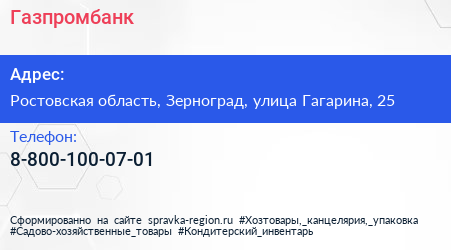 Газпромбанк по адресу Ростовская область, Зерноград, улица Гагарина, 25 в дальнейшем Организация, размещена в следующих категориях: