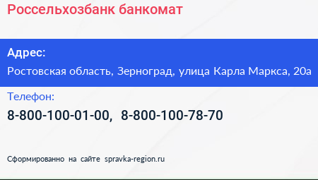 Россельхозбанк, банкомат по адресу Ростовская область, Зерноград, улица Карла Маркса, 20а в дальнейшем Организация, размещена в следующих категориях: