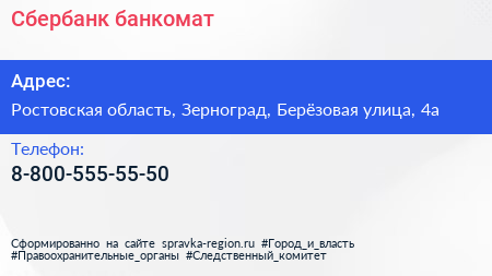 Сбербанк, банкомат по адресу Ростовская область, Зерноград, Берёзовая улица, 4а в дальнейшем Организация, размещена в следующих категориях: