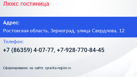 Люкс, гостиница по адресу Ростовская область, Зерноград, улица Свердлова, 12 в дальнейшем Организация, размещена в следующих категориях:
