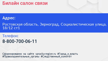 Билайн, салон связи по адресу Ростовская область, Зерноград, Социалистическая улица, 18/12 ст1 в дальнейшем Организация, размещена в следующих категориях:
