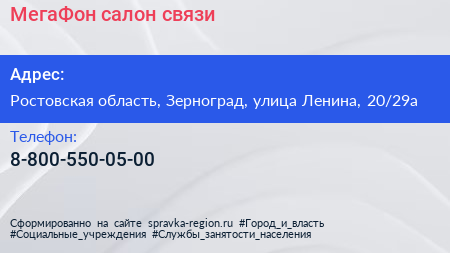 МегаФон, салон связи по адресу Ростовская область, Зерноград, улица Ленина, 20/29а в дальнейшем Организация, размещена в следующих категориях: