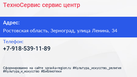 ТехноСервис, сервис-центр по адресу Ростовская область, Зерноград, улица Ленина, 34 в дальнейшем Организация, размещена в следующих категориях: