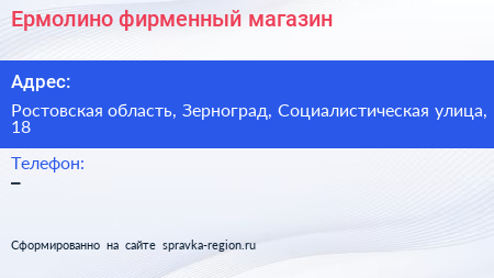 Ермолино, фирменный магазин по адресу Ростовская область, Зерноград, Социалистическая улица, 18 в дальнейшем Организация, размещена в следующих категориях:
