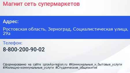 Магнит, сеть супермаркетов по адресу Ростовская область, Зерноград, Социалистическая улица, 29а в дальнейшем Организация, размещена в следующих категориях: