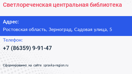 Светлореченская центральная библиотека по адресу Ростовская область, Зерноград, Садовая улица, 5 в дальнейшем Организация, размещена в следующих категориях: