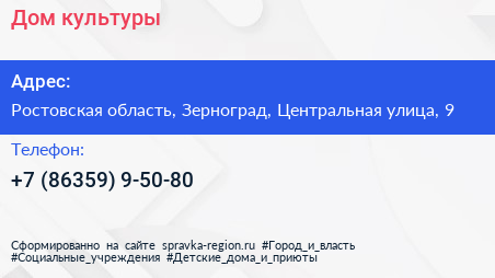 Дом культуры по адресу Ростовская область, Зерноград, Центральная улица, 9 в дальнейшем Организация, размещена в следующих категориях: