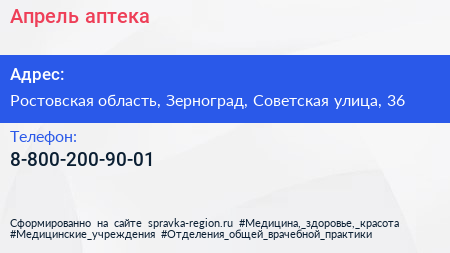 Апрель, аптека по адресу Ростовская область, Зерноград, Советская улица, 36 в дальнейшем Организация, размещена в следующих категориях:
