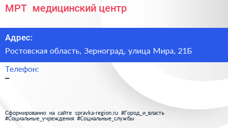 МРТ+, медицинский центр по адресу Ростовская область, Зерноград, улица Мира, 21Б в дальнейшем Организация, размещена в следующих категориях: