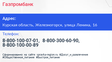 Газпромбанк по адресу Курская область, Железногорск, улица Ленина, 16 в дальнейшем Организация, размещена в следующих категориях: