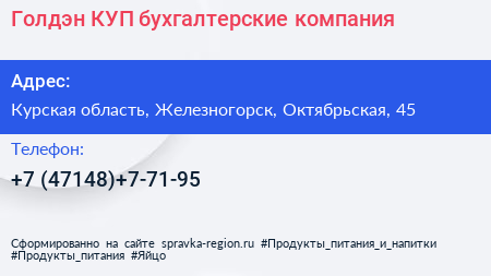 Голдэн КУП, бухгалтерские компания по адресу Курская область, Железногорск, Октябрьская, 45 в дальнейшем Организация, размещена в следующих категориях: