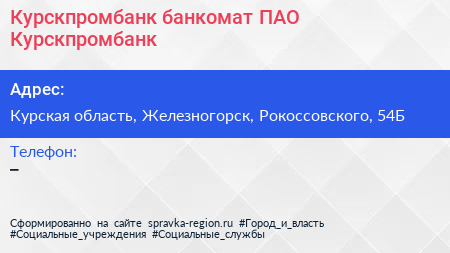 Курскпромбанк, банкомат, ПАО Курскпромбанк по адресу Курская область, Железногорск, Рокоссовского, 54Б в дальнейшем Организация, размещена в следующих категориях: