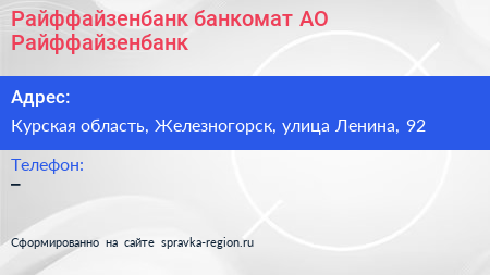 Райффайзенбанк, банкомат, АО Райффайзенбанк по адресу Курская область, Железногорск, улица Ленина, 92 в дальнейшем Организация, размещена в следующих категориях: