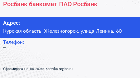 Росбанк, банкомат, ПАО Росбанк по адресу Курская область, Железногорск, улица Ленина, 60 в дальнейшем Организация, размещена в следующих категориях:
