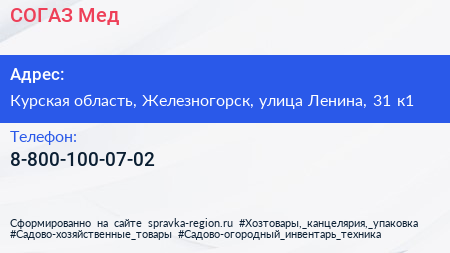 СОГАЗ-Мед по адресу Курская область, Железногорск, улица Ленина, 31 к1 в дальнейшем Организация, размещена в следующих категориях: